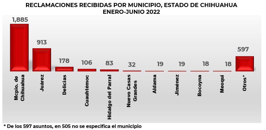 Las reclamaciones recibidas por la CONDUSEF en 2022 en esta entidad, se interpusieron por usuarios que habitan en 35 municipios, siendo el de Chihuahua el que concentró el 48.7% del total, seguido por Cd. Juárez con el 23.6%.
