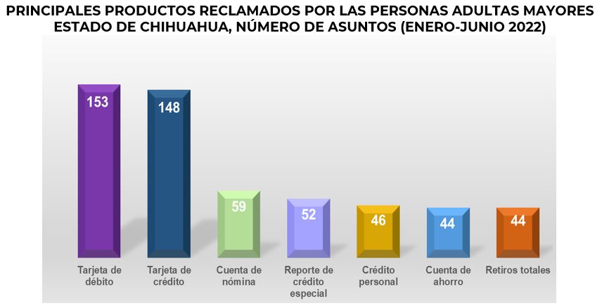 Por su parte, el segmentode personas adultas mayores representó el 28.2% de las reclamaciones totales en el periodo enero - junio de 2022 y los productos que más reclamó este grupo de la población fueron la Tarjeta de débito, la Tarjeta de crédito y la Cuenta de nómina.