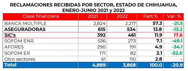 Al analizar los asuntos por sector de origen, destaca la Banca Múltiple con el 57% del total de los asuntos recibidos (2,217 reclamaciones), seguida por las Aseguradoras con el 14% (534 asuntos). El sector de las Sociedades de Información Crediticia (Burós de Crédito), fue el único de los 6 principales, que registró un incremento de sus reclamaciones en 2022, como se aprecia en el cuadro siguiente:
