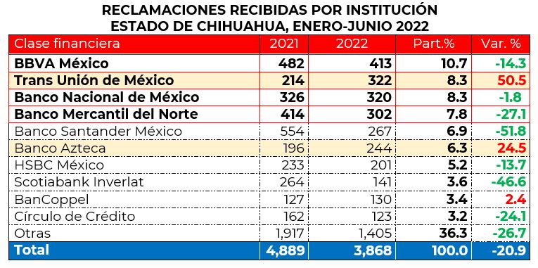 De las 10 instituciones con mayores reclamaciones en la entidad, 2 de ellas mostraron un incremento importante respecto a 2021: Trans Unión de México al pasar de 214 asuntos a 322 y Banco Azteca al pasar de 196 a 244 asuntos.