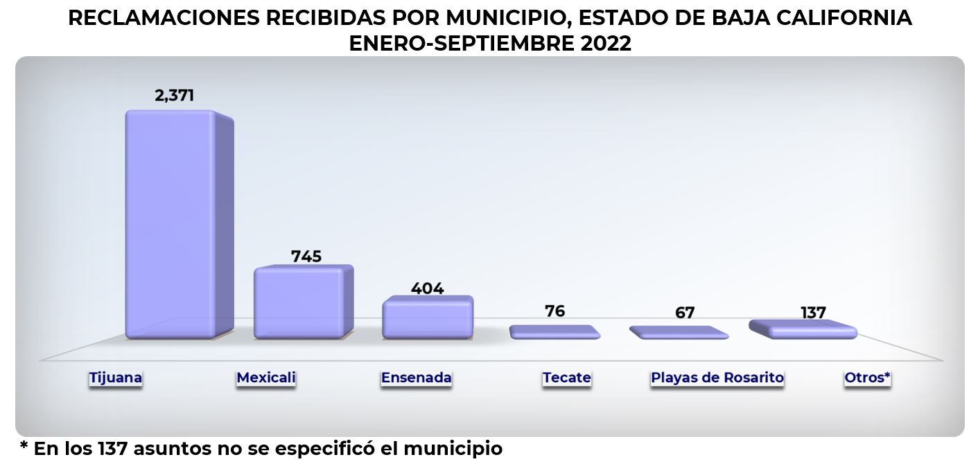 Las reclamaciones recibidas por la CONDUSEF en 2022, en esta entidad, se interpusieron por usuarios que habitan en 5 municipios, siendo el de Tijuana el que concentró el 62.4% del total, seguido por el municipio de Mexicali con el 19.6%.