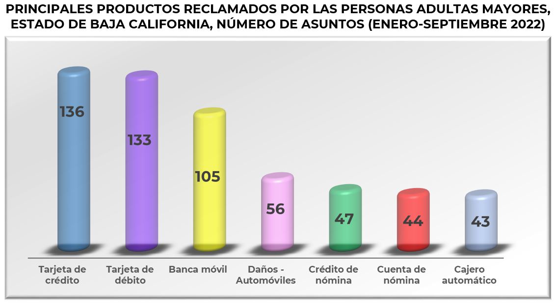 Por su parte, el segmentode personas adultas mayores representó el 28% de las reclamaciones totales en el periodo enero - septiembre de 2022 y los productos que más reclamó este grupo de la población fueron tarjeta de crédito, la tarjeta de débito y la banca móvil.