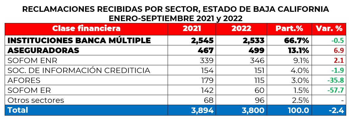 Durante el periodo enero - septiembre de 2022la Unidad de Atención a Usuarios (UAU) de la CONDUSEF, registró 3,800 reclamaciones en el estado de Baja California,lo que representó un decremento de 2.4% respecto al mismo periodo de 2021, cuando se registraron 3,894 reclamaciones. Respecto a las reclamaciones recibidas a nivel nacional, esta Unidad participó con el 2.1%.