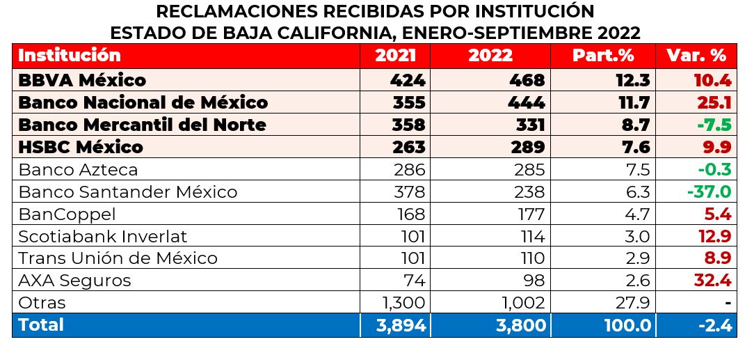 De las 10 instituciones con mayor número de reclamaciones en la entidad, Banco Nacional de México y AXA Seguros, mostraron un incremento importante de 25.1% y 32.4%, respectivamente en relación a 2021.
