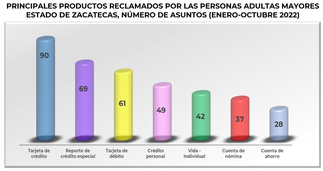 En este periodo, de los cinco principales productos, solo reporte de crédito especial mostró un incremento en sus reclamaciones respecto al mismo periodo de 2021, de 4.0%. Dentro de las causas más representativas por las cuales se presentaron las reclamaciones en la entidad están: actualización de historial crediticio no realizada con 183 asuntos, seguido por solicitud de cancelación del contrato y/o póliza no atendida y/o no aplicada con 177 y emisión de reporte de crédito especial (RCE) con 152 asuntos. En conjunto, estas 3 causas concentraron el 21.3% del total. Por su parte, el segmento de personas adultas mayores representó el 27.4% de las reclamaciones totales en el periodo enero - octubre de 2022 y los productos que más reclamó este grupo de la población fueron la Tarjeta de crédito, Reporte de crédito especial y la Tarjeta de débito.