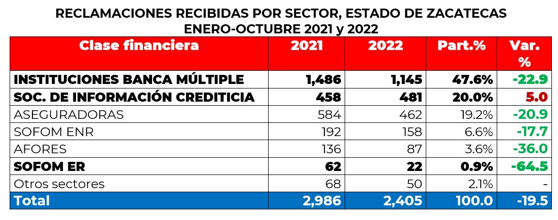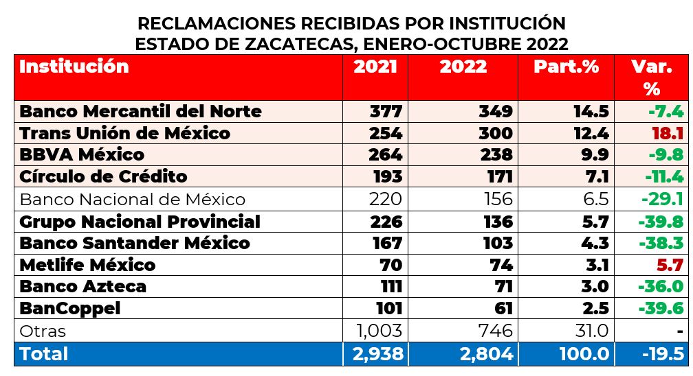 Por su parte, las instituciones que registraron el mayor número de reclamaciones en el estado de Zacatecas fueron Banco Mercantil del Norte, Trans Unión de México, conocido como Buró de Crédito, BBVA México y Círculo de Crédito, que en conjunto estas 4 concentraron el 44% del total.