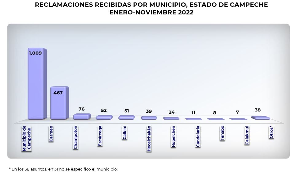 Las reclamaciones recibidas por CONDUSEF en 2022 en esta entidad, se interpusieron por usuarios que habitan en 11 municipios (de los 13existentes), siendo el de Campeche el que concentró el 56.6% del total, seguido por el municipio de Carmen con el 26.2%.