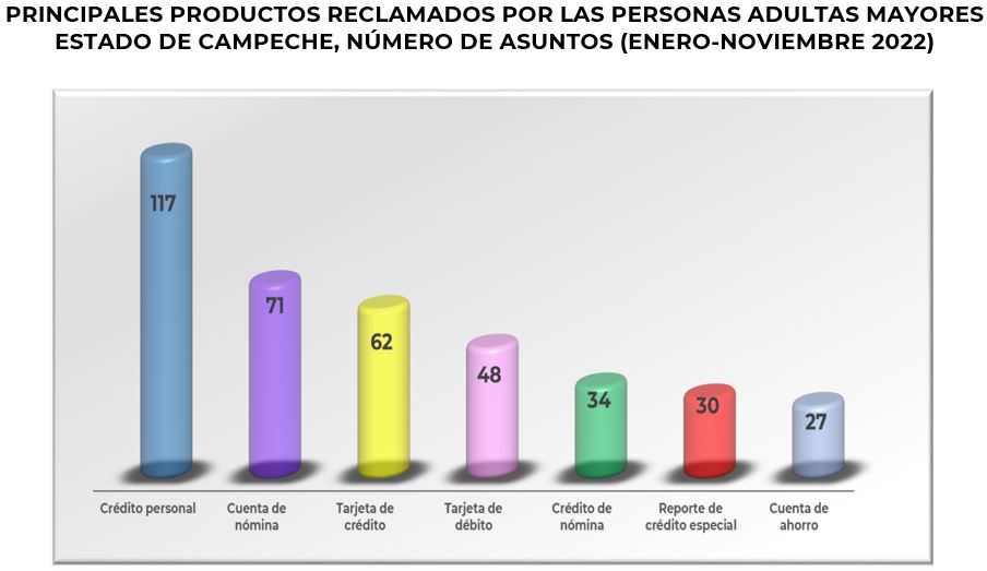Por su parte, el segmento de personas adultas mayores representó el 34% de las reclamaciones totales en el periodo enero - noviembre de 2022 y los productos que más reclamó este grupo de la población fueron el Crédito personal, la Cuenta de nómina y la Tarjeta de crédito.