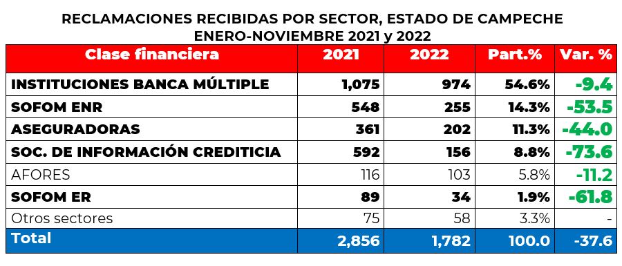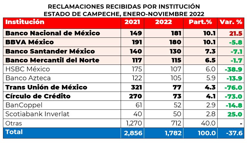 Por su parte, las instituciones que registraron el mayor número de reclamaciones en el estado de Campeche fueron Banco Nacional de México, BBVA México, Banco Santander México y Banco Mercantil del Norte, que en conjunto estas 4 concentraron el 34% del total.