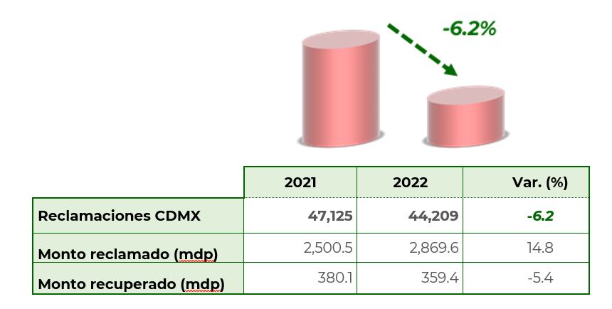 De las 44,209 reclamaciones presentadas en la Ciudad de México, se reclamó un monto de 2 mil 870 millones de pesos, de los cuales se recuperó el 12.5%, es decir, 359.4 millones.