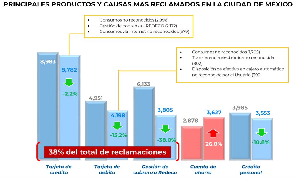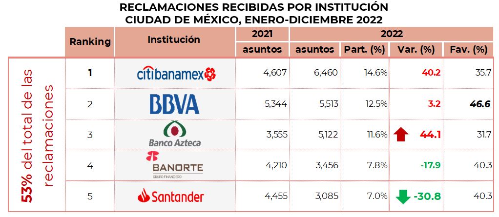 Por su parte, las instituciones que de manera individual registraron el mayor número de reclamaciones en la Ciudad de México fueron: Banco Nacional de México, BBVA México, Banco Azteca, Banco Mercantil del Norte y Banco Santander, que en conjunto concentraron el 53% del total.