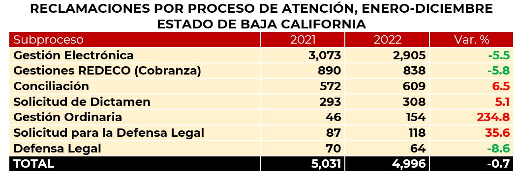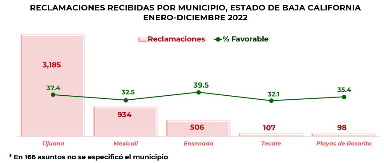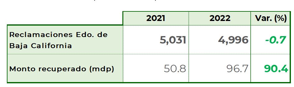 Durante 2022el estado de Baja California registró 4,996 reclamaciones,que significó un decremento de 0.7% respecto a 2021, cuando se reportaron 5,031 asuntos. En este estado se cuenta con una Unidad de Atención a Usuarios (UAU) ubicada en Tijuana, B.C.