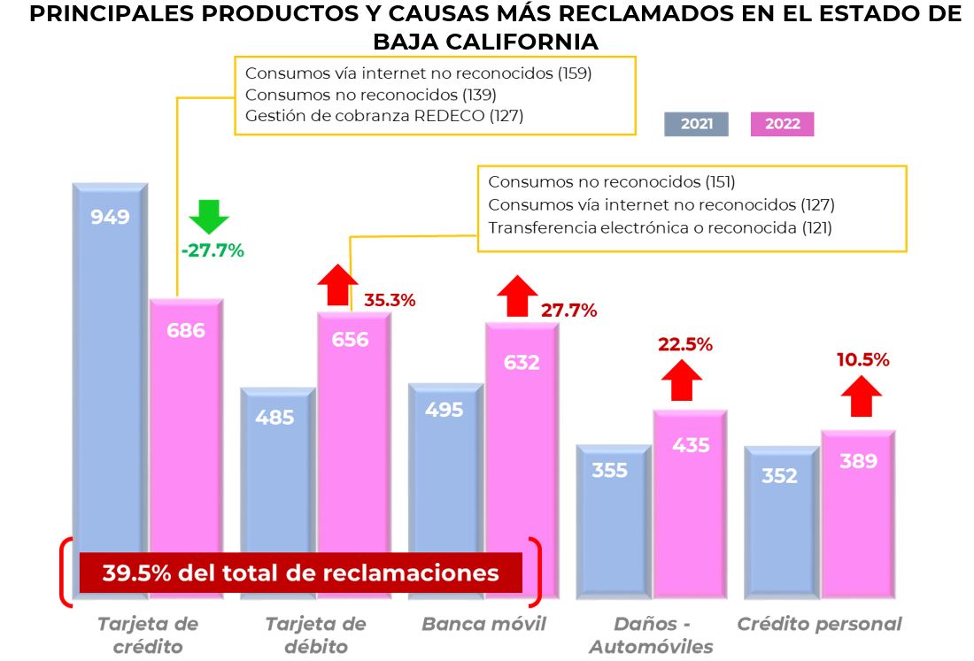 En este periodo, de los cinco principales productos, solo la Tarjeta de crédito mostró un decremento en sus reclamaciones de 27.7% con respecto al mismo periodo de 2021, mientras que tarjeta de débito, banca móvil, daños automóviles y crédito personal, mostraron un incremento en relación a 2021.
