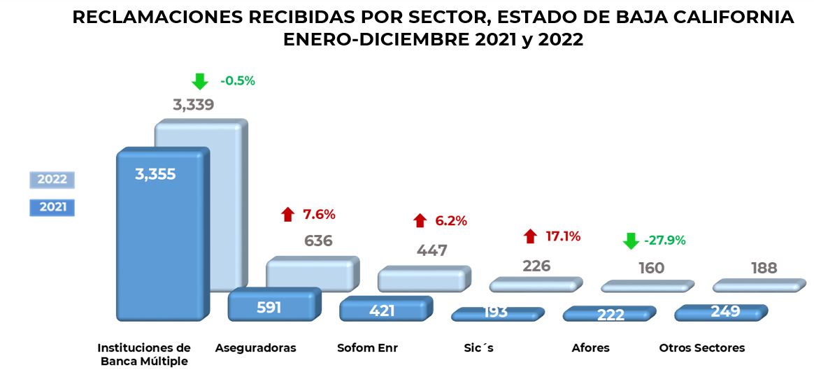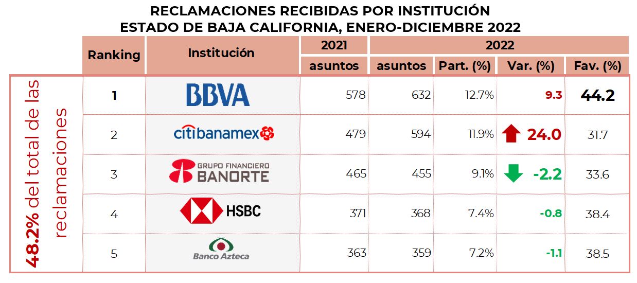 Por su parte, las instituciones que de manera individual registraron el mayor número de reclamaciones en el estado de Baja California fueron, BBVA México, Banco Nacional de México, Banco Mercantil, HSBC y Banco Azteca, que en conjunto concentraron el 48.2% del total.