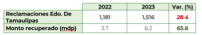 De enero al mes de abrilde 2023el estado de Tamaulipas registró1,516 reclamaciones,que significó un aumento del 28.4% respecto al 2022, cuando se reportaron 1,181asuntos. El estado cuenta con una Unidad de Atención al Usuario (UAU) ubicada en el municipio de Tampico.
