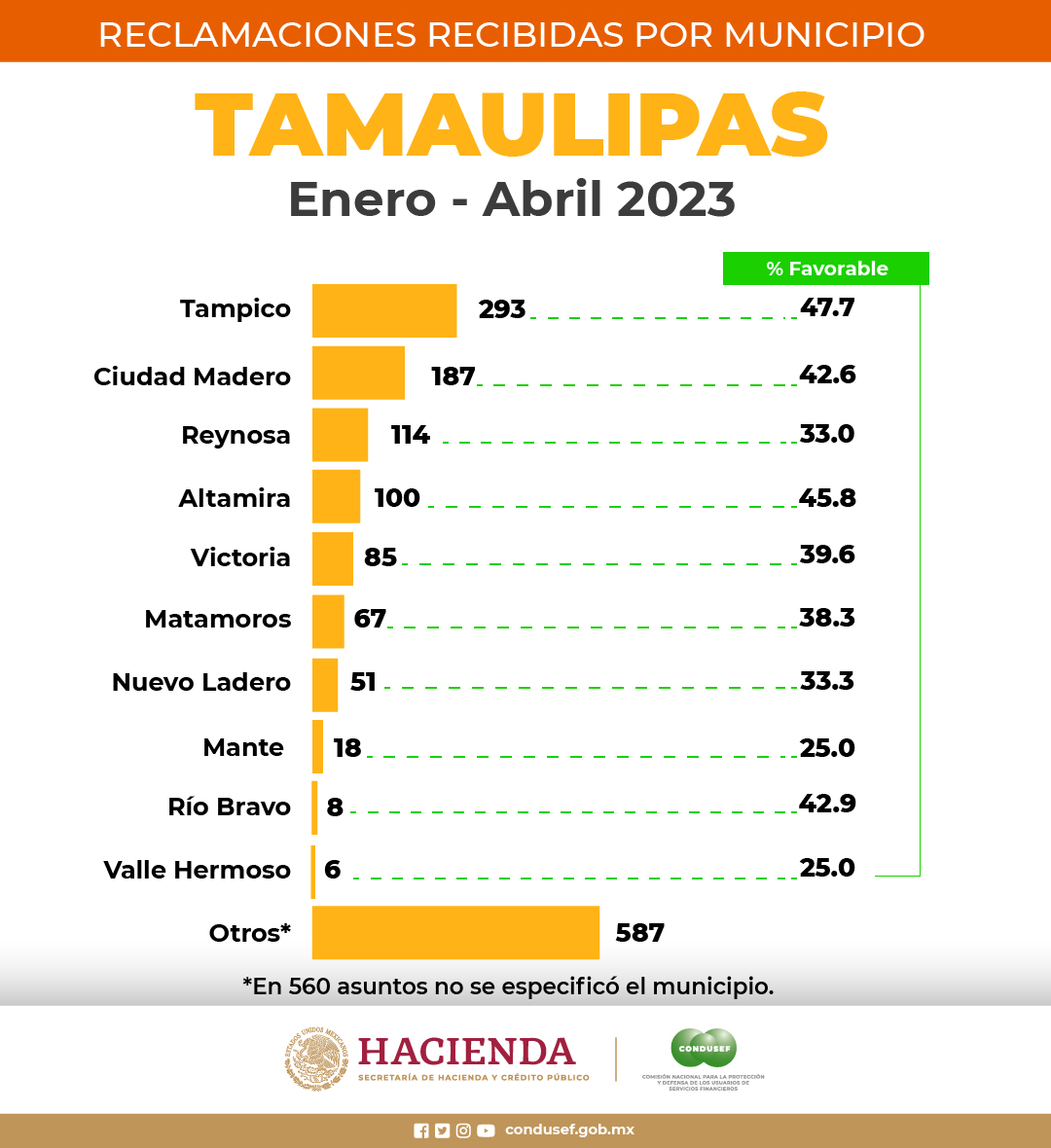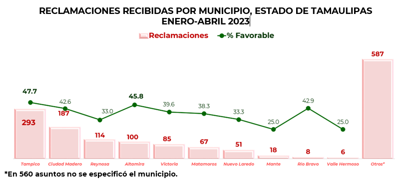 Las reclamaciones recibidas por CONDUSEF en esta entidad, se interpusieron por usuarios que habitan en 30 municipios, de 43 que integran el estado, siendo el municipio de Tampico, el que concentró el 19.3% del total, seguido por el municipio de Ciudad Madero con el 12.3%.