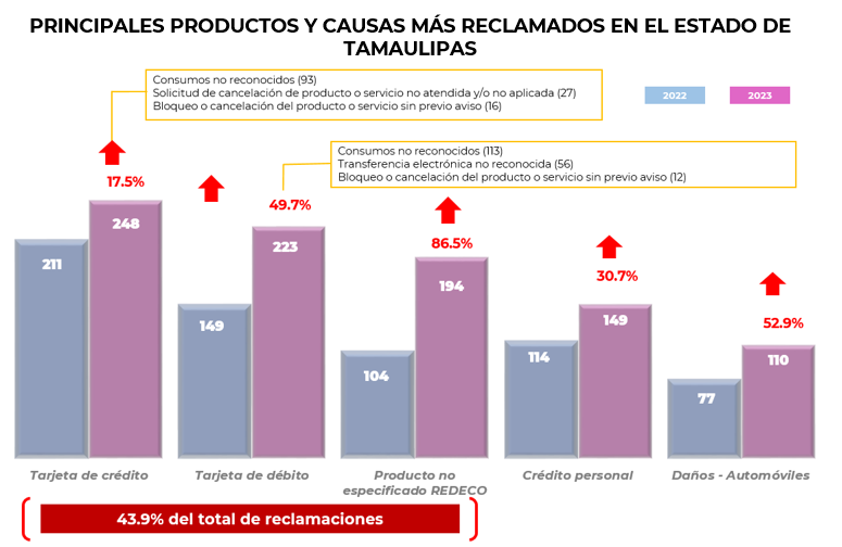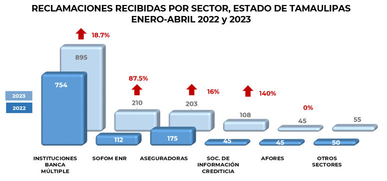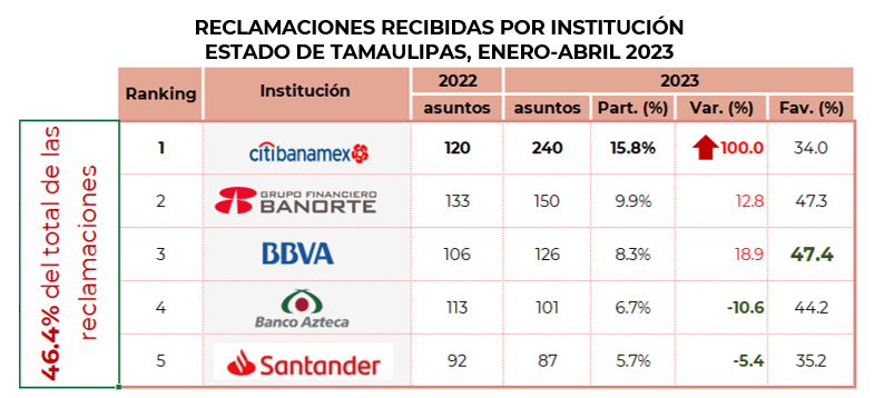 Por su parte, las instituciones que de manera individual registraron el mayor número de reclamaciones en el estado de Tamaulipas, fueron: Citibanamex, Banorte, BBVA, Banco Azteca Santander que en conjunto concentraron el 46.4% del total.