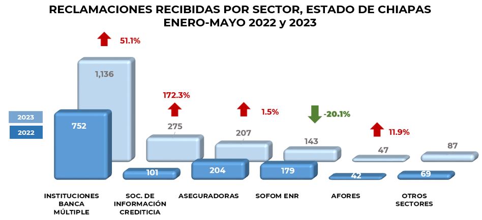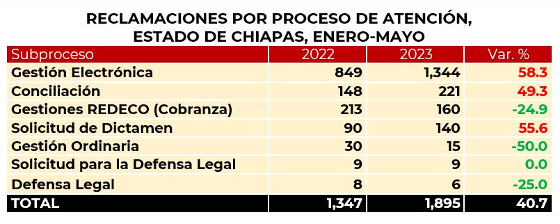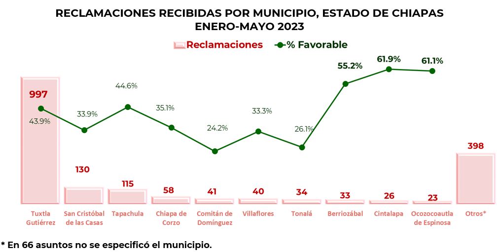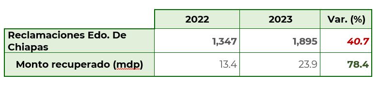 De enero a mayode 2023el estado de Chiapas registró1,895 reclamaciones,que significó un aumento del 40.7% respecto al 2022, cuando se reportaron 1,347asuntos. El estado cuenta con una Unidad de Atención a Usuarios (UAU) ubicada en el municipio de Tuxtla Gutiérrez.