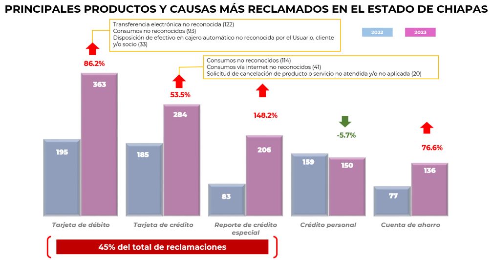 Lo municipios que registraron el mayor % de resolución a favor del usuario fueron: Cintalapa con el 61.9%, seguido por Ocozocoautla de Espinosa con el 61.1% y Berriozábal con el 55.2%. Con respecto a los productos más reclamados en el periodo, fueron: la tarjeta de débito, tarjeta de crédito y Reporte de Crédito Especial que en conjunto representaron el 45% del total de las reclamaciones en esta entidad.