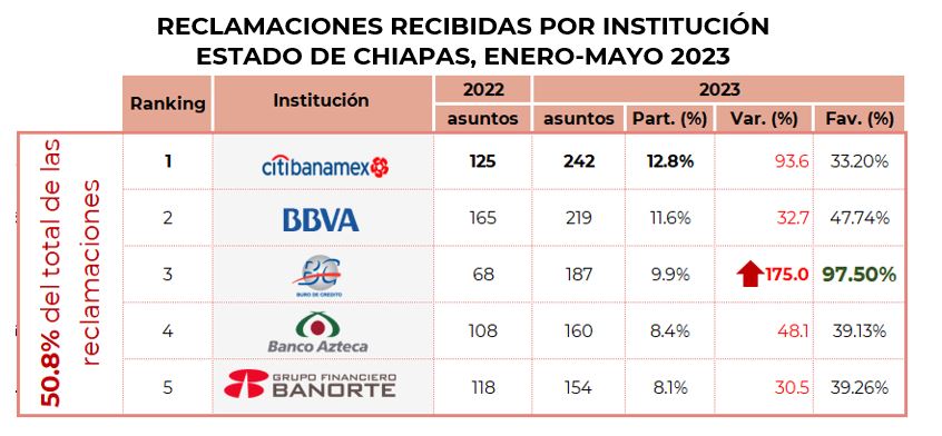 Por su parte, las instituciones que de manera individual registraron el mayor número de reclamaciones en el estado de Chiapas, fueron: Citibanamex, BBVA, Buró de Crédito, Banco Azteca y Banorte, que en conjunto concentraron el 50.8% del total.