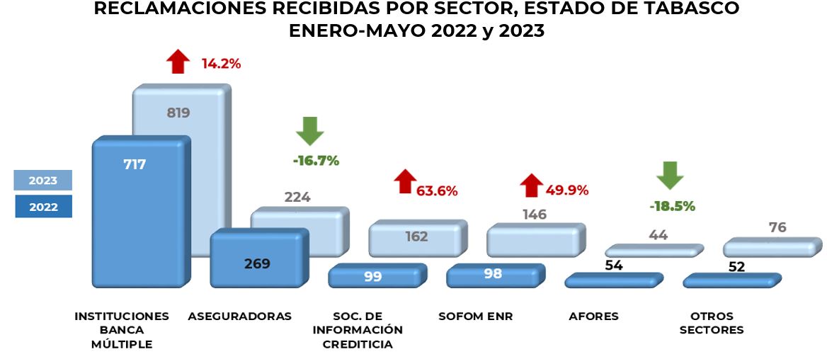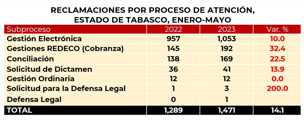 Durante los primeros 5 meses del año, el estado de Tabasco registró1,471 reclamaciones,que significó un aumento del 14.1% respecto al 2022, cuando se reportaron 1,289 asuntos. El estado cuenta con una Unidad de Atención a Usuarios (UAU) ubicada en la Ciudad de Villahermosa en el municipio de Centro.