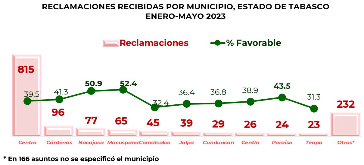 Las reclamaciones recibidas por la CONDUSEF en esta entidad, se interpusieron por usuarios que habitan en 17 municipios de 17 que integran el estado, siendo el municipio de Centro el que concentró el 55.4% del total, seguido por el municipio de Cárdenas con el 6.5%.