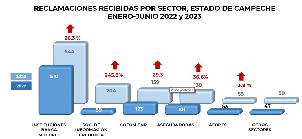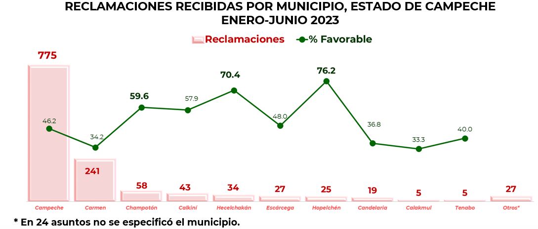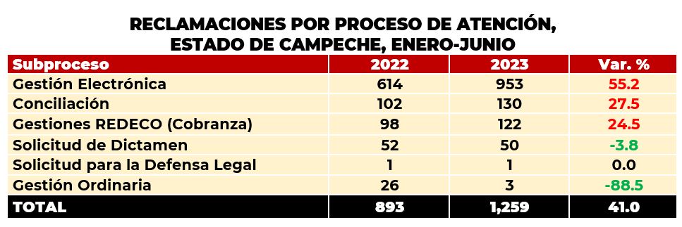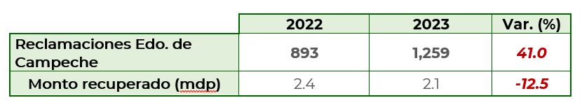 Durante el primer semestre del año, el estado de Campeche registró1,259reclamaciones,que significó un incremento del 41% con respecto al 2022, cuando se reportaron 893 asuntos. El estado cuenta con una Unidad de Atención al Usuario (UAU) ubicada en el municipio de Campeche.