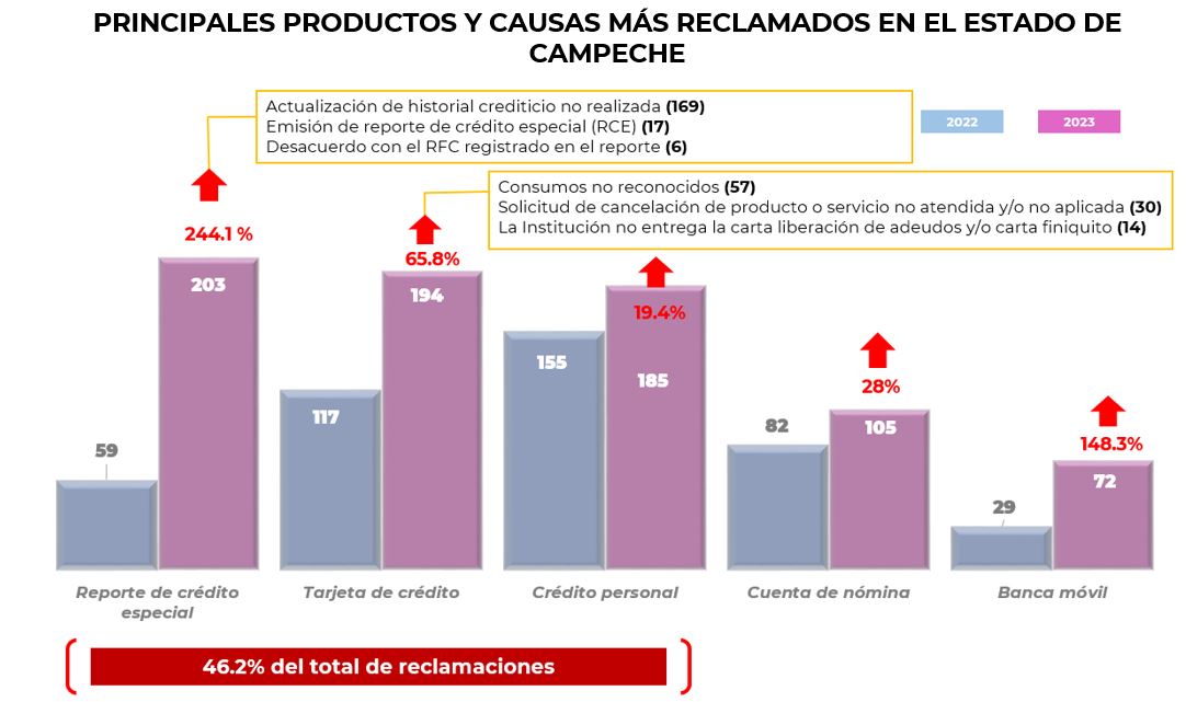 En este periodo, de los principales productos mencionados, destaca el “Reporte de crédito especial” que registró un aumento en sus reclamaciones de 244.1% respecto al mismo periodo de 2022, esto relacionado principalmente con la actualización del historial crediticio de los usuarios.
