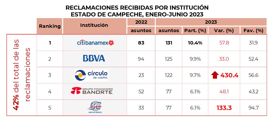 Por su parte, las instituciones que de manera individual registraron el mayor número de reclamaciones en el estado de Campeche, fueron: Citibanamex, BBVA, Círculo de Crédito, Banorte y Trans Unión de México (Buró de Crédito) que en conjunto concentraron el 42% del total.