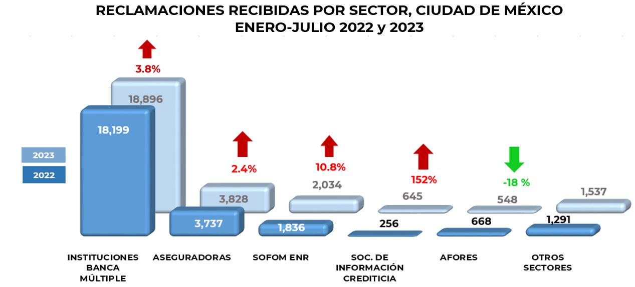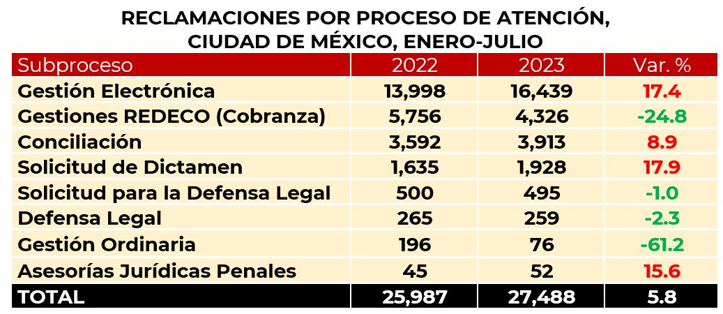 De enero a julio de 2023, la Ciudad de México a través de sus tres Unidades de Atención a Usuarios captó 27,488 reclamaciones,que significó un crecimiento del 5.8% respecto al 2022, cuando se reportaron 25,987 asuntos. Del total de las reclamaciones recibidas a nivel nacional, estas tres Unidades concentraron el 16.8%.