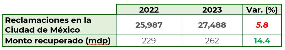 De enero a julio de 2023, en esta entidad se recuperó de las reclamaciones con monto monetario un importe de 262 millones de pesos, lo que significó un aumento del 14.4% respecto a lo recuperado en 2022, en consonancia con el comportamiento que se registró en el total de reclamaciones en los primeros 7 meses del año.