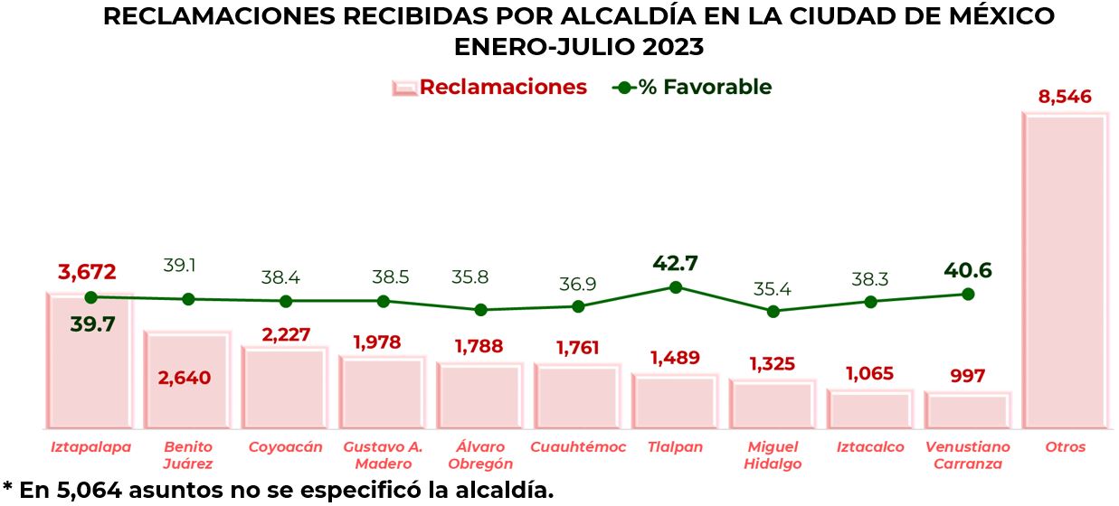 Las reclamaciones recibidas por la Condusef en esta entidad se interpusieron por usuarios de las 16 alcaldías que la integran, siendo la de Iztapalapa la que concentró el 13.4% del total, seguido por la alcaldía de Benito Juárez con el 9.6%.