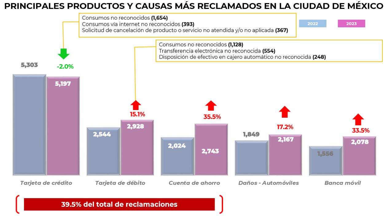 Por su parte, las instituciones que de manera individual registraron el mayor número de reclamaciones en la Ciudad de México, fueron: Citibanamex, BBVA, Banco Azteca, Banorte y Santander que en conjunto concentraron el 54% del total.