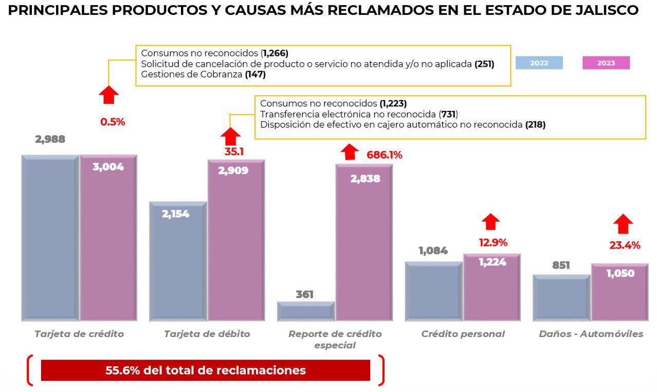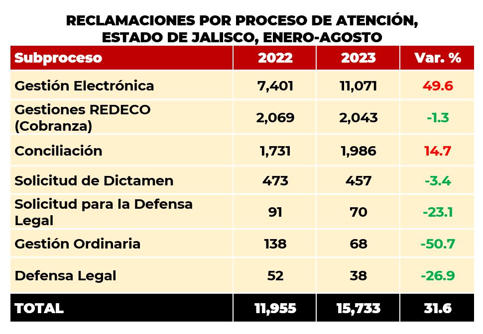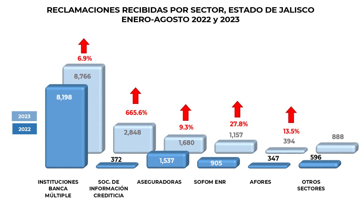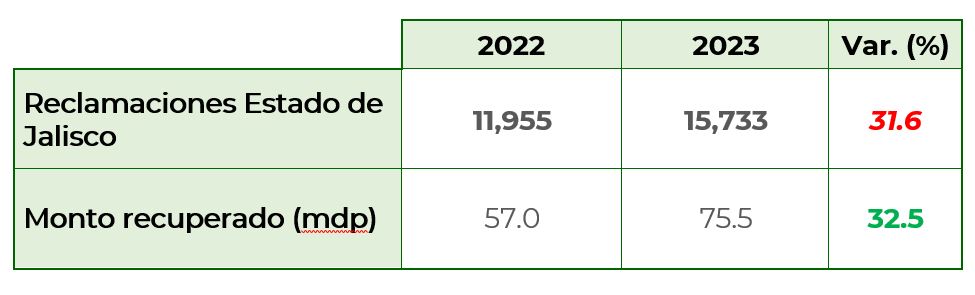 De enero a agosto de 2023, los habitantes del estado de Jalisco presentaron 15,733 reclamaciones,que significó un crecimiento del 31.6% con respecto al 2022, cuando se reportaron 11,955 asuntos. Del total de las reclamaciones recibidas a nivel nacional, esta entidad concentró el 8.2%.