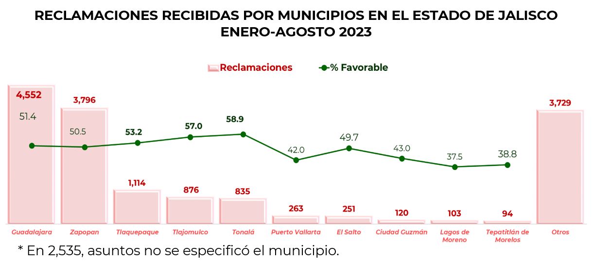 Los municipios que registraron el mayor % de resolución a favor del usuario fueron: Tonalá con el 58.9%, seguido por Tlajomulco con el 57.0% y Tlaquepaque con el 53.2%.