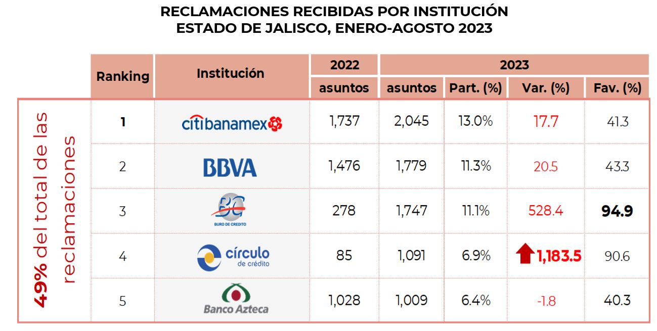 Por su parte, las instituciones que de manera individual registraron el mayor número de reclamaciones en el Estado de Jalisco, fueron: Citibanamex, BBVA, los Burós de Crédito y Banco Azteca que en conjunto concentraron el 49% del total.