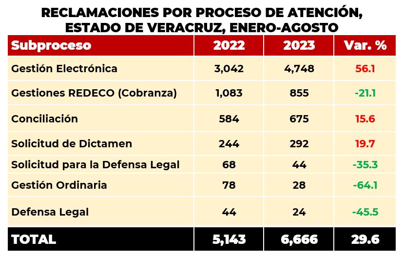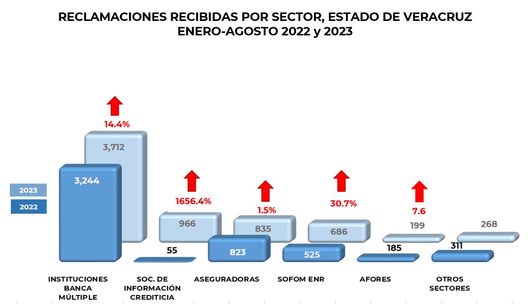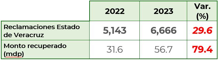 De enero a agosto de 2023, los habitantes del estado de Veracruz presentaron 6,666 reclamaciones,que significó un crecimiento del 29.6% con respecto al 2022, cuando se reportaron 5,143 asuntos. Del total de las reclamaciones recibidas a nivel nacional, esta entidad concentró el 3.5%.