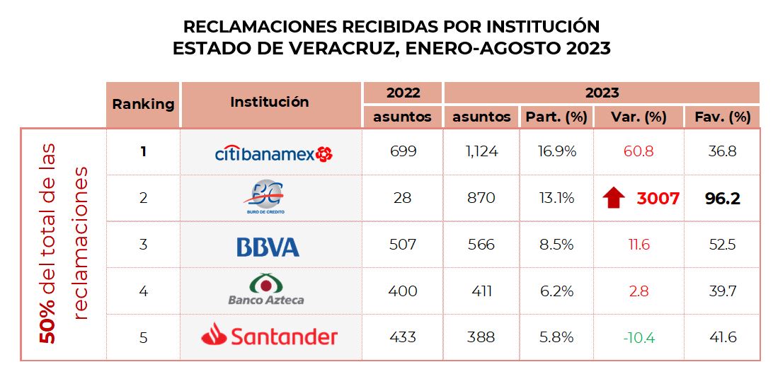 Por su parte, las instituciones que de manera individual registraron el mayor número de reclamaciones en el Estado de Veracruz, fueron: Citibanamex, Buró de Crédito, BBVA, Banco Azteca y Santander que en conjunto concentraron el 50% del total.