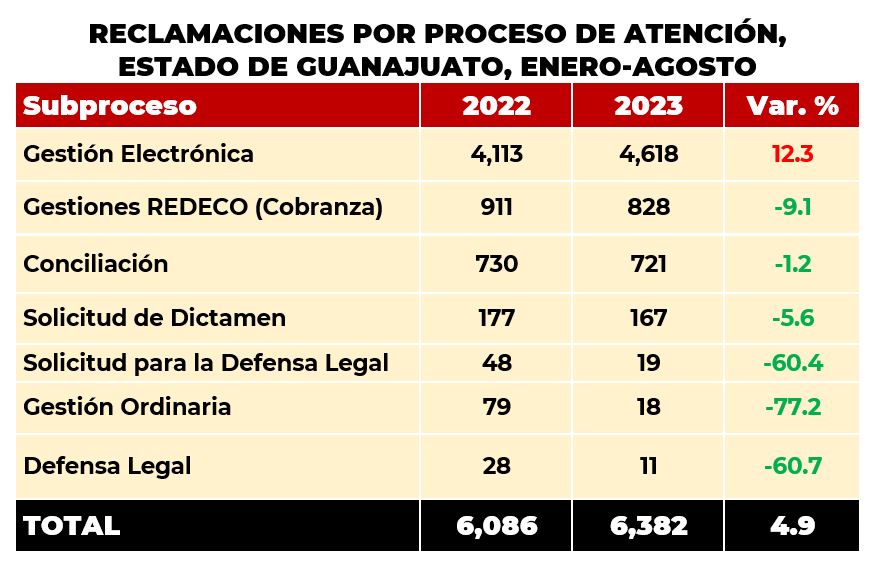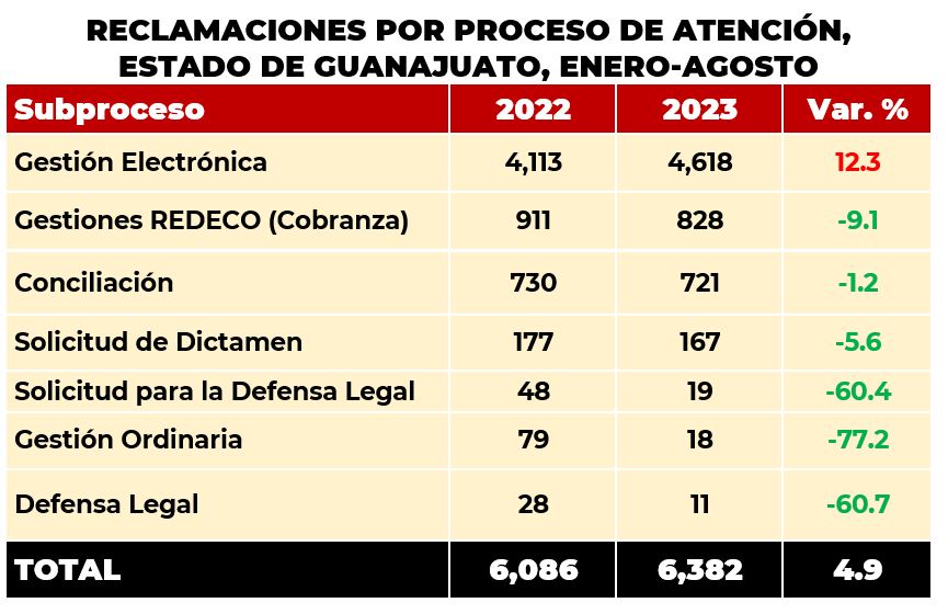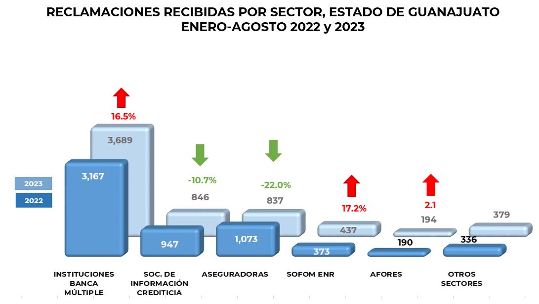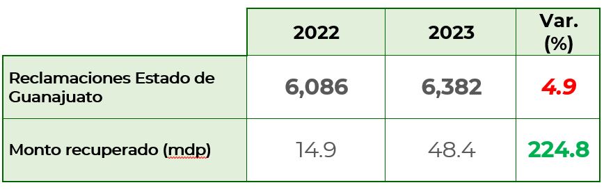 De enero a agosto de 2023, los habitantes del estado de Guanajuato, presentaron 6,382 reclamaciones,que significó un crecimiento del 4.9% con respecto al 2022, cuando se reportaron 6,086 asuntos. Del total de las reclamaciones recibidas a nivel nacional, esta entidad concentró el 3.3%.