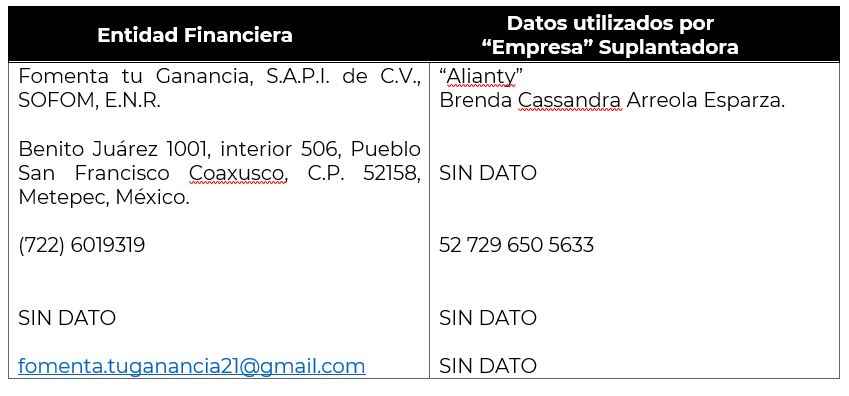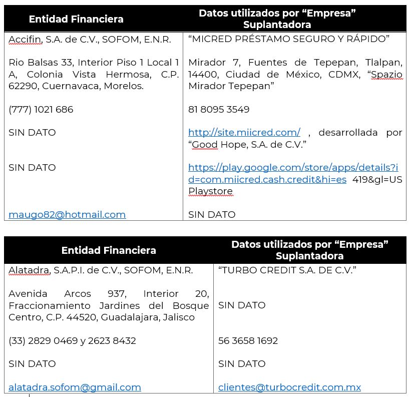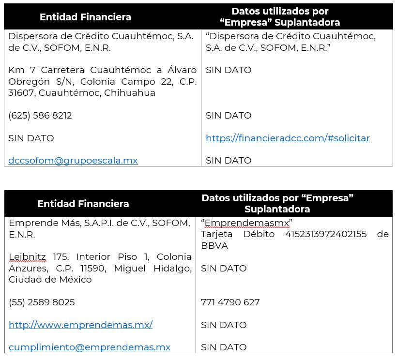 - Utilizan (sin autorización), nombres comerciales, denominaciones sociales y/o imagen corporativa de las entidades financieras debidamente autorizadas y registradas, para hacerse pasar por ellas, cambiando una o varias letras del nombre, colores o formas de los logotipos, para engañar al público, haciendo uso tanto por medios convencionales, en folletos, como en medios digitales (páginas de internet, redes sociales, aplicaciones móviles, correos electrónicos, etc.).