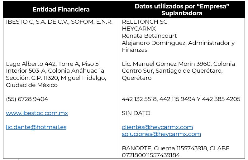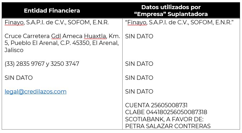 - Piden anticipos de dinero en efectivo o mediante depósito a una cuenta bancaria (a nombre de una empresa o persona física distinta a la entidad financiera suplantada) con la supuesta finalidad de gestionar el crédito, adelantar mensualidades, pagar gastos por apertura o como fianza en garantía, generalmente por el equivalente al 10% del monto total del crédito solicitado, que puede ser desde mil hasta doscientos mil pesos.
