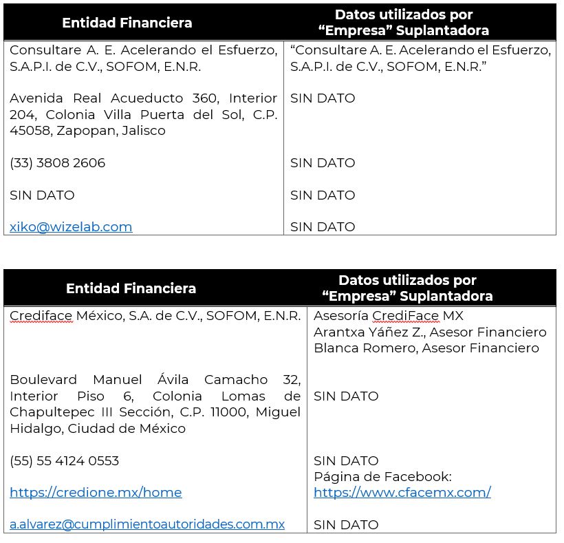 Al mes de agosto de 2023 esta Comisión Nacional contaba con reportes de 161 instituciones financieras que habían sido afectadas por la suplantación o uso indebido y sin autorización de su nombre comercial, denominación, logo e incluso de algunos de sus datos fiscales o administrativos, a las que ahora se suman las 25 instituciones detalladas a continuación: