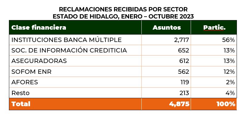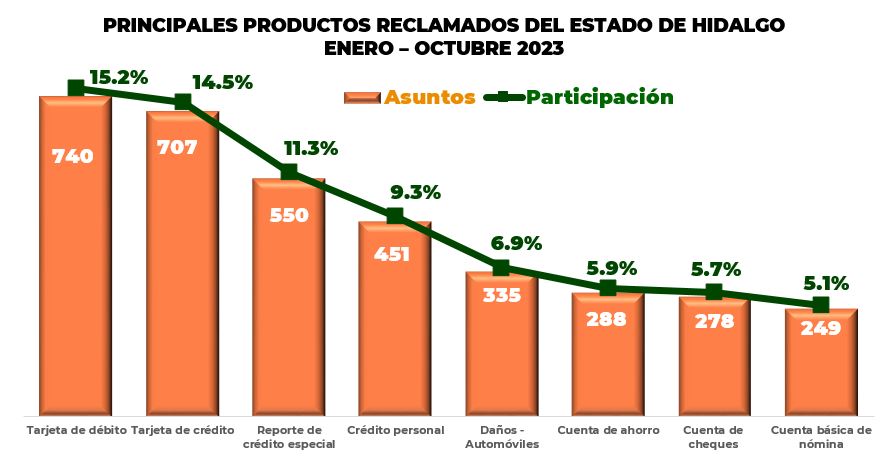 La Comisión Nacional para la Protección y Defensa de los Usuarios de Servicios Financieros (CONDUSEF) informa sobre la evolución de las reclamaciones iniciadas en el estado de Hidalgo en el periodo enero-octubre de 2023. Durante los primeros 10 meses de 2023 la CONDUSEF registró 4,875 reclamaciones en el estado de Hidalgo; los productos más reclamados fueron la Tarjeta de débito, la Tarjeta de crédito y el Reporte de Crédito Especial, que en conjunto representaron el 41% del total de las reclamaciones registradas.