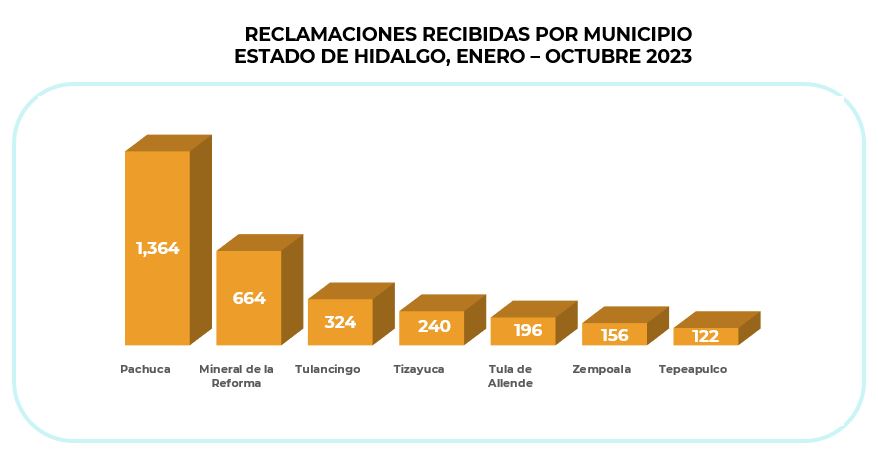 Por su parte, la principal causa por la cual se reclamó fue la Transferencia electrónica no reconocida que representó el 11% del total, seguida de los consumos no reconocidos con el 7.6% y los consumos vía internet no reconocidos con el 7.2% Las 4,875 reclamaciones que se registraron en el estado, fueron realizadas por usuarios que habitan en 80 municipios de los 84 que integran esta entidad, de los cuales uno de ellos, el de Pachuca concentró el 28% del total de dichas reclamaciones.