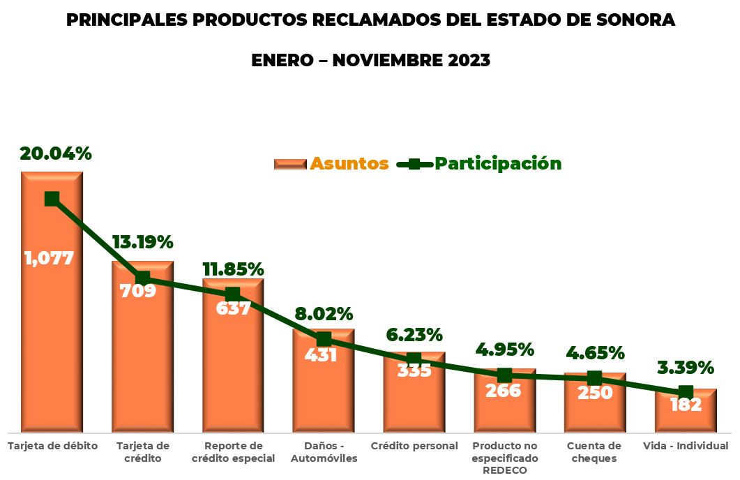 Durante los 11 meses transcurridos de 2023 la CONDUSEF registró 5,375 reclamaciones en el estado de Sonora; los productos más reclamados fueron la Tarjeta de débito, la Tarjeta de crédito y el Reporte de crédito especial, que en conjunto representaron el 45.1% del total de las reclamaciones registradas.