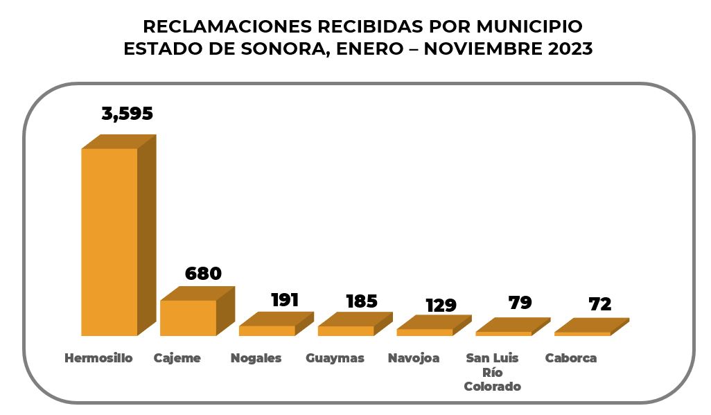 Las 5,375 reclamaciones que se registraron de la entidad fueron realizadas por usuarios que habitan en 48 municipios, de los cuales uno de ellos, el de Hermosillo concentró el 66.9% del total de dichas reclamaciones.