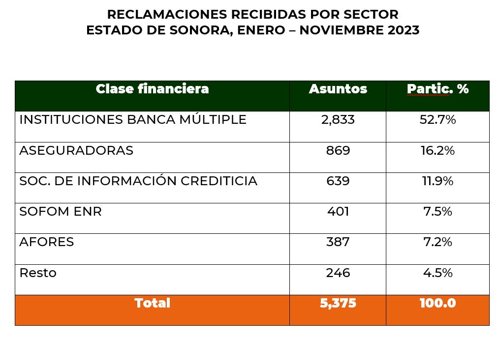 La Comisión Nacional para la Protección y Defensa de los Usuarios de Servicios Financieros (CONDUSEF) informa sobre la evolución de las reclamaciones iniciadas en el estado de Sonora en el periodo enero-noviembre de 2023.