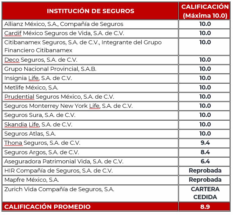 Como resultado final de la supervisión, una vez corregidas las irregularidades detectadas, se tiene que 12 compañías obtuvieron calificación de 10, 2 reprobaron y 1 dejó de comercializar el producto y cedió su cartera a otra compañía, como se muestra a continuación: