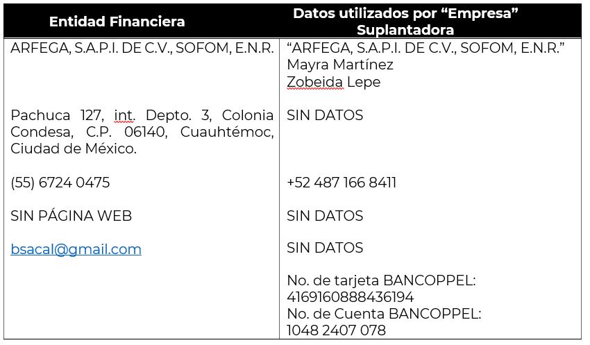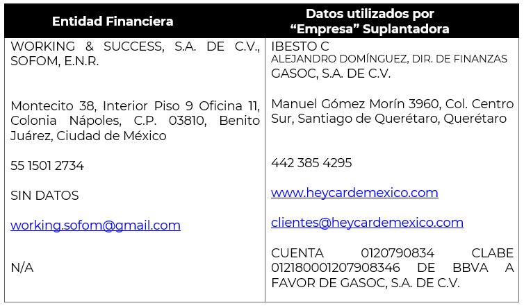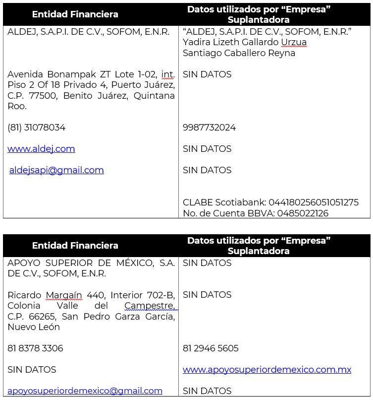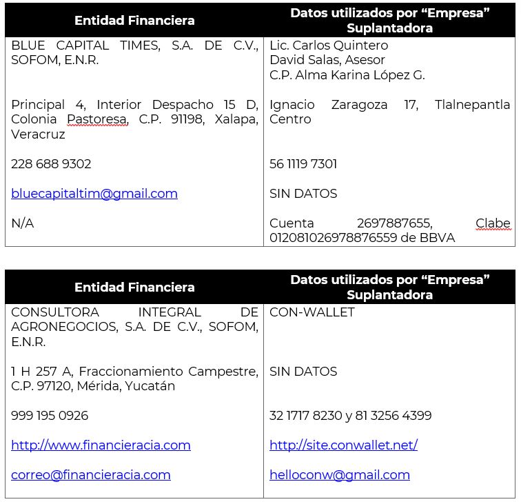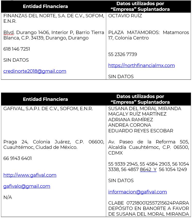 - Utilizan (sin autorización), nombres comerciales, denominaciones sociales y/o imagen corporativa de las entidades financieras debidamente autorizadas y registradas que las identifican como tal, para hacerse pasar por ellas y engañar al usuario con el fin de obtener un beneficio principalmente económicos o tus datos personales, en ocasiones cambiando una o varias letras del nombre, colores o formas de los logotipos, para engañar al público, haciendo uso tanto por medios convencionales, en folletos, como en medios digitales (páginas de internet, redes sociales, aplicaciones móviles, correos electrónicos, etc.).