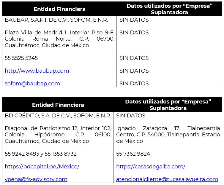 RELACIÓN DE INSTITUCIONES QUE HAN INFORMADO SER SUPLANTADAS Y DATOS PROPORCIONADOS RESPECTO DE TERCEROS QUE PRESUNTAMENTE SE OSTENTAN COMO ENTIDAD O TERCEROS QUE SEÑALAN ESTAR RELACIONADOS CON ESTOS: